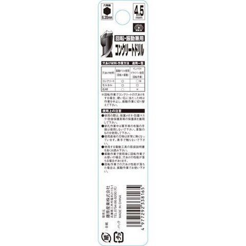 | ・サイズ:4.5mm ・回転・振動兼用 ・6.35mm六角軸 ・適合機種:インパクトドライバー・回転ドリル・振動ドリル ・(材質)特殊鋼 |