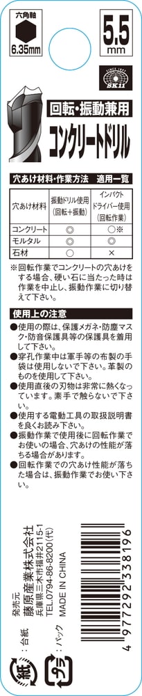 | サイズ:5.5mm 回転、振動兼用 6.35mm六角軸 適合機種:インパクトドライバー、回転ドリル、振動ドリル |