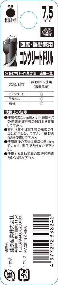 | サイズ:7.5mm 回転・振動兼用 丸軸滑り止め付 適合機種:回転ドリル・振動ドリル |