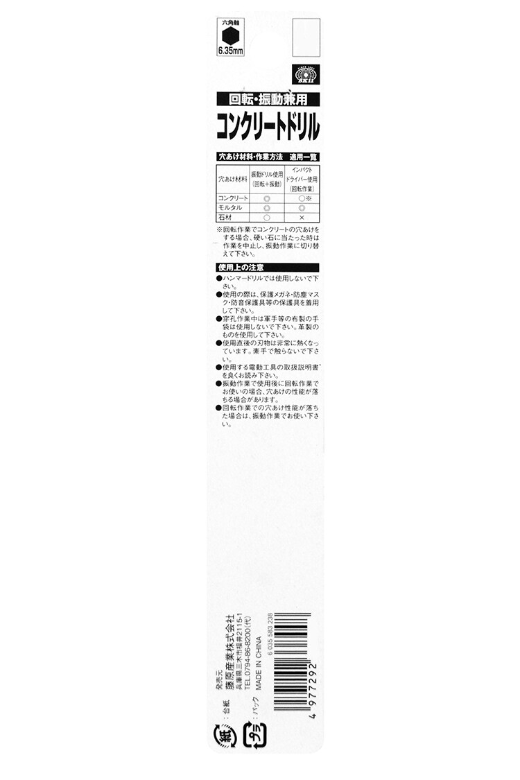 | ・サイズ:5.0mm ・回転・振動兼用 ・6.35mm六角軸 ・全長:150mm ・有効長:90mm ・適合機種:インパクトドライバー・回転ドリル・振動ドリル ・材質:特殊鋼 |