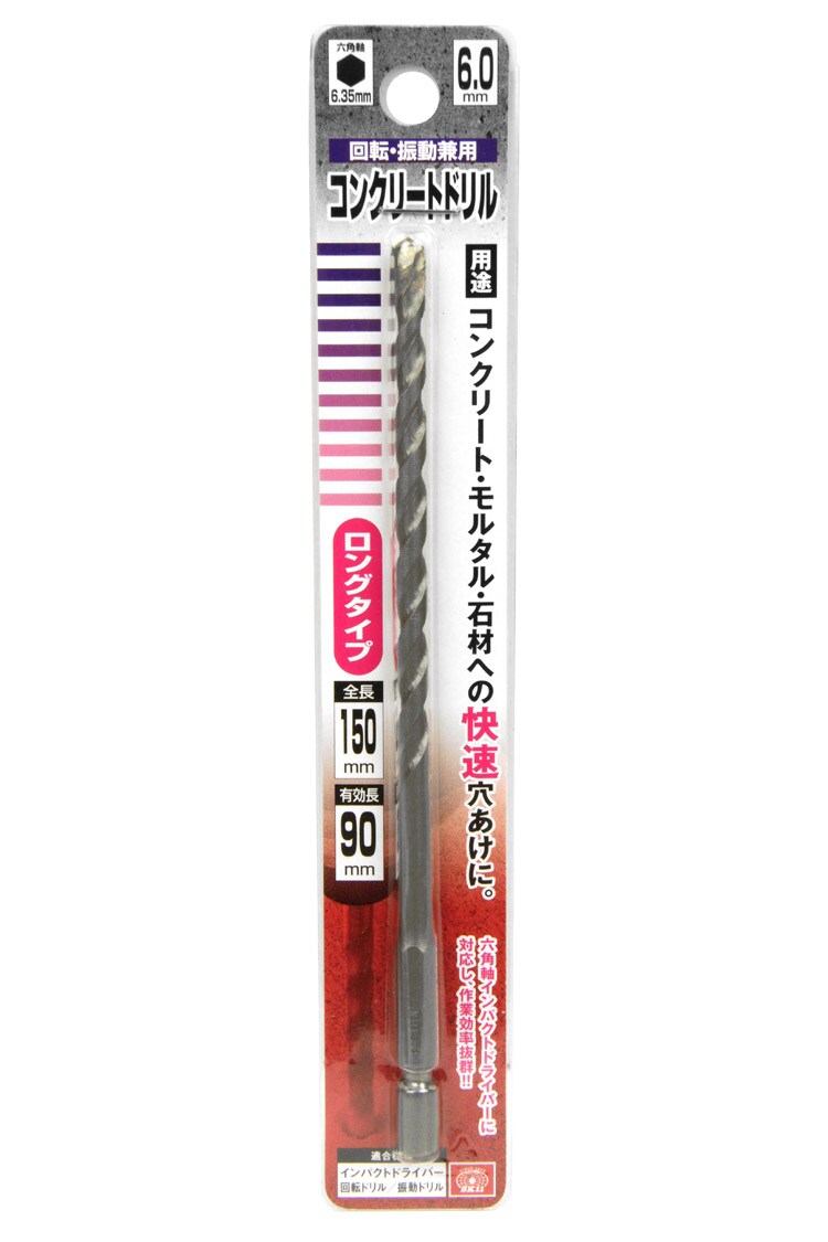 | ・サイズ:6.0mm ・回転・振動兼用 ・6.35mm六角軸 ・全長:150mm ・有効長:90mm ・適合機種:インパクトドライバー・回転ドリル・振動ドリル ・材質:特殊鋼 |