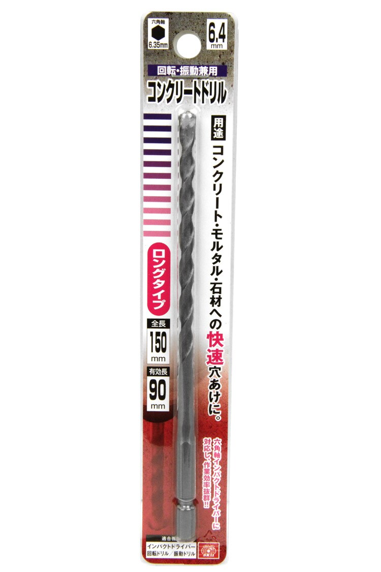 | ・サイズ:6.4mm ・回転・振動兼用 ・6.35mm六角軸 ・全長:150mm ・有効長:90mm ・適合機種:インパクトドライバー・回転ドリル・振動ドリル ・材質:特殊鋼 |