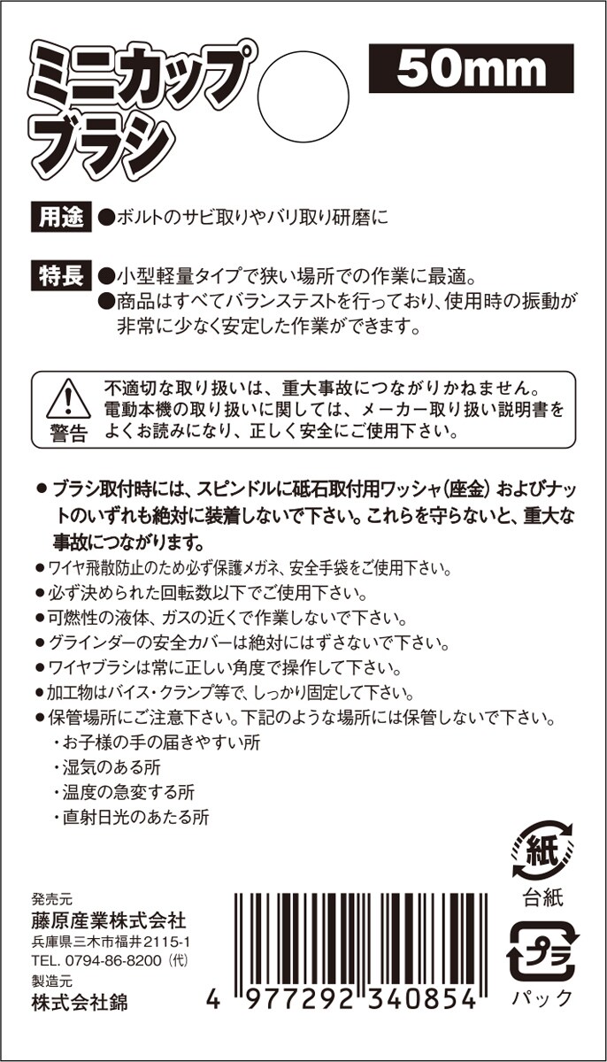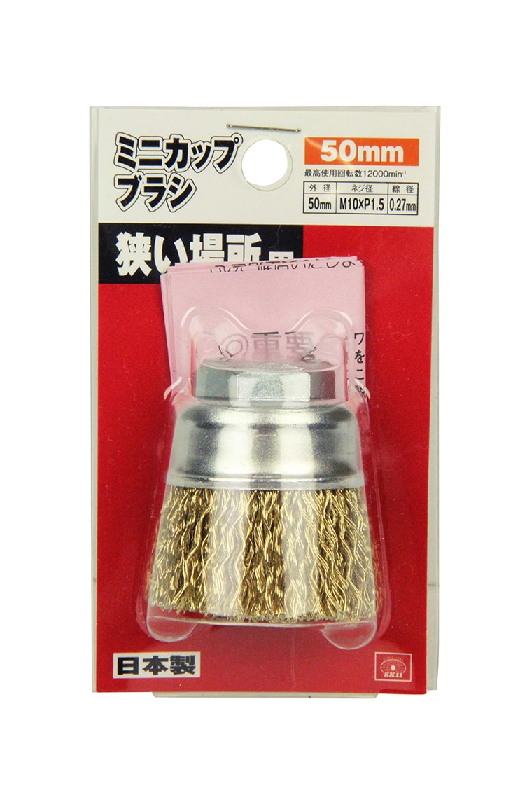 | ・外径:50mm ・ネジ径:M10×P1.5 ・線径:0.27mm ・最高使用回転数:12000min-1 ・適用機種:ディスクグラインダー ・材質:ワイヤー:硬鋼線に真鍮メッキ |