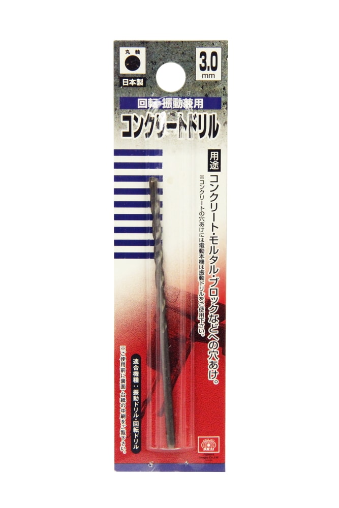 | ・サイズ:3.0mm ・丸軸 ・使用機種:振動ドリル・回転ドリル ・適応材(回転ドリル使用):ブロックレンガ○・モルタル◎・ALC◎・FRP○・タイル○ ・適応材(振動ドリル使用時):無筋コンクリート◎・ブロックレンガ◎・モルタル◎・ALC△・FRP△ ・材質:刃先:超硬チップ |