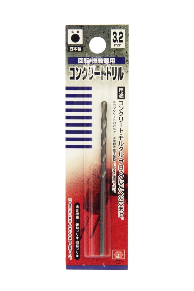 | ・サイズ:3.2mm ・丸軸 ・使用機種:振動ドリル・回転ドリル ・適応材(回転ドリル使用時):ブロックレンガ○・モルタル◎・ALC◎・FRP○・タイル○ ・適応材(振動ドリル使用時):無筋コンクリート◎・ブロックレンガ◎・モルタル◎・ALC△・FRP△ ・材質:刃先:超硬チップ |
