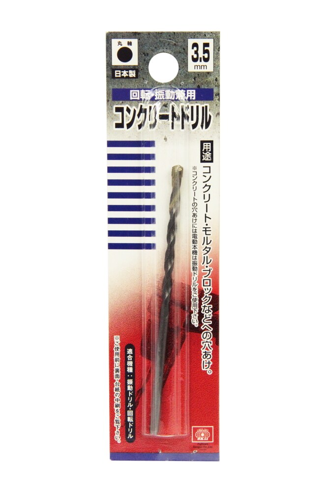 | ・サイズ:3.5mm ・丸軸 ・使用機種:振動ドリル・回転ドリル ・適応材(回転ドリル使用時):ブロックレンガ○・モルタル◎・ALC◎・FRP○・タイル○ ・適応材(振動ドリル使用時):無筋コンクリート◎・ブロックレンガ◎・モルタル◎・ALC△・FRP△ ・材質:刃先:超硬チップ |