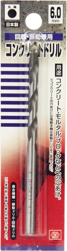 | ・サイズ:6.0mm ・丸軸 ・使用機種:振動ドリル・回転ドリル ・適応材(回転ドリル使用時):ブロックレンガ○・モルタル◎・ALC◎・FRP○・タイル○ ・適応材(振動ドリル使用時):無筋コンクリート◎・ブロックレンガ◎・モルタル◎・ALC△・FRP△ ・材質:刃先:超硬チップ |