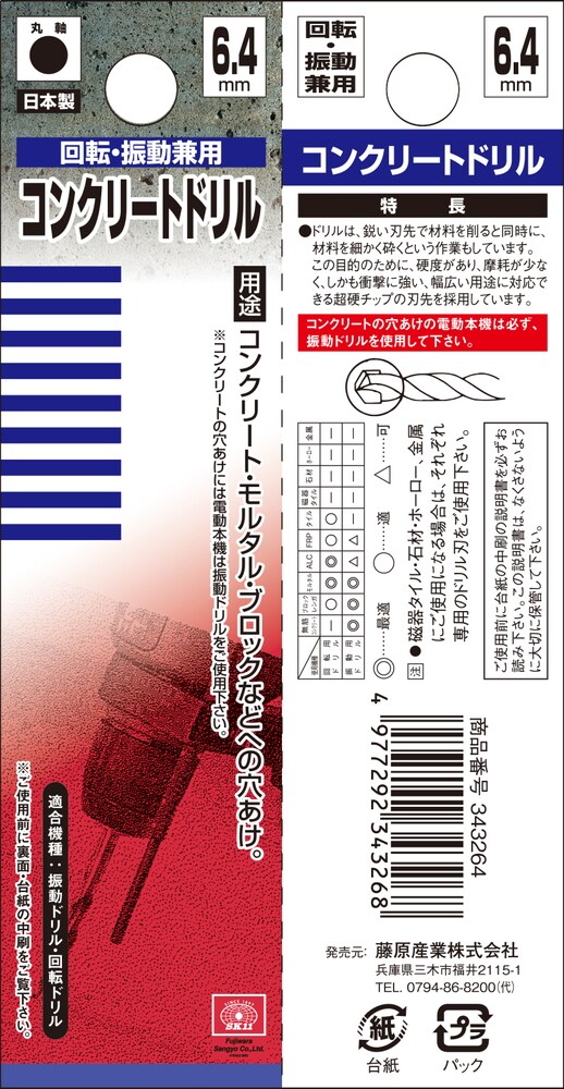 | ・サイズ:6.4mm ・丸軸 ・使用機種:振動ドリル・回転ドリル ・適応材(回転ドリル使用時):ブロックレンガ○・モルタル◎・ALC◎・FRP○・タイル○ ・適応材(振動ドリル使用時):無筋コンクリート◎・ブロックレンガ◎・モルタル◎・ALC△・FRP△ ・材質:刃先:超硬チップ |