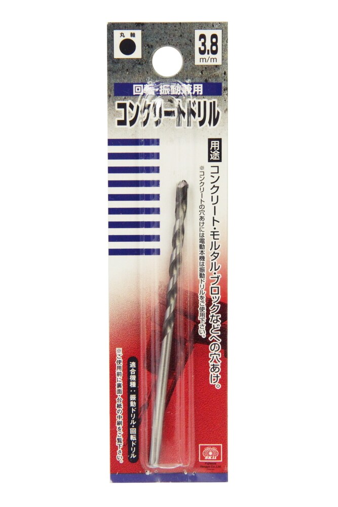 | ・サイズ:3.8mm ・丸軸 ・使用機種:振動ドリル・回転ドリル ・適応材(回転ドリル使用時):ブロックレンガ○・モルタル◎・ALC◎・FRP○・タイル○ ・適応材(振動ドリル使用時):無筋コンクリート◎・ブロックレンガ◎・モルタル◎・ALC△・FRP△ ・材質:刃先:超硬チップ |