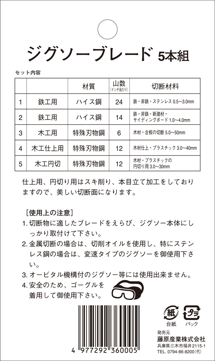 No.1鉄工用ジグソーブレード 、No.2鉄工用ジグソーブレード 、No.3木工用ジグソーブレード、No.4木工仕上用ジグソーブレード、No.5木工円切ジグソーブレード