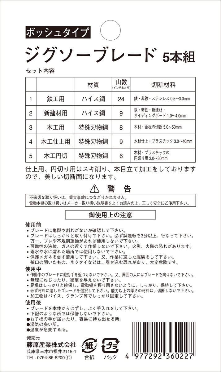 | ・No.1鉄工用ジグソーブレード:山数24 ・No.2鉄工用ジグソーブレード:山数9 ・No.3木工用ジグソーブレード:山数8 ・No.4木工仕上用ジグソーブレード:山数9 ・No.5木工円切ジグソーブレード:山数6 ・マキタ・日立・リョービ・ボッシュ兼用 |