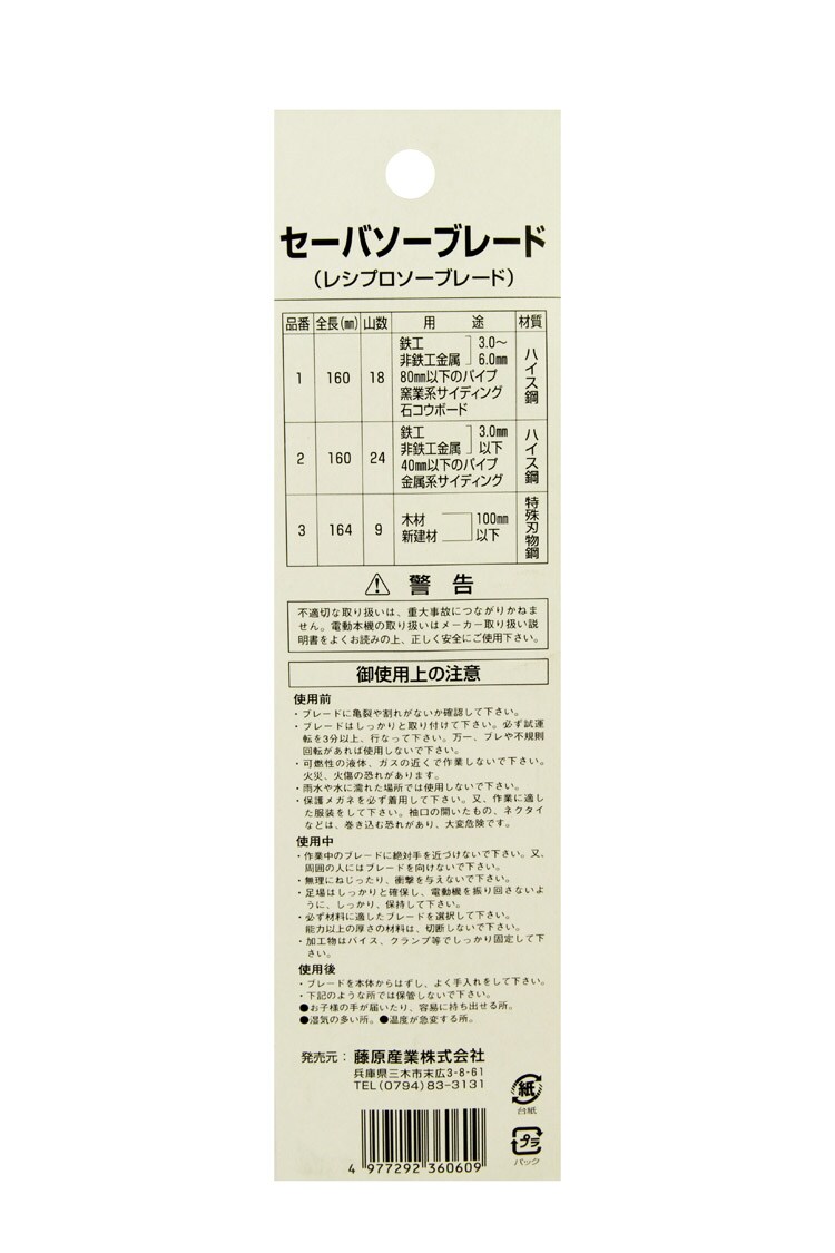 | ・2枚入 ・全長:160mm ・山数(インチ当り):18 ・切断能力:鉄工・非鉄工金属:3.0~6.0mm・80mm以下のパイプ・窯業系サイディング・石膏ボード ・材質:ハイス鋼。 |