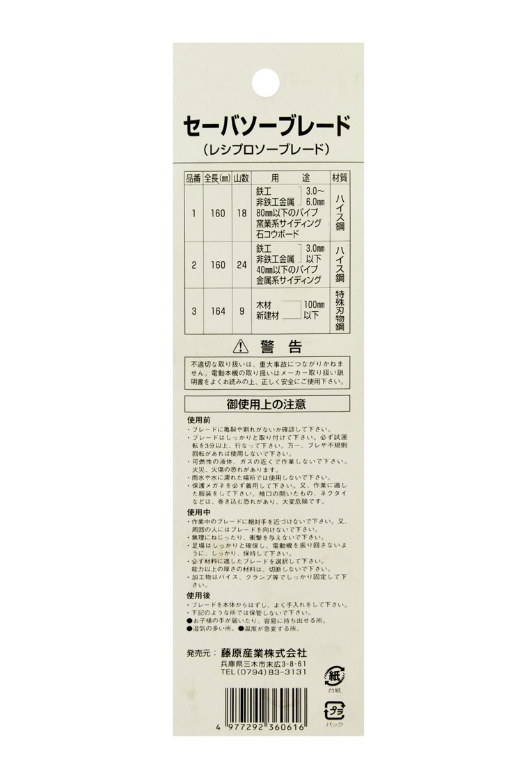| ・2枚入 ・全長:160mm ・山数(インチ当り):24 ・切断能力:鉄工・非鉄工金属:3.0mm以下・40mm以下のパイプ・金属系サイディング ・材質:ハイス鋼。 |