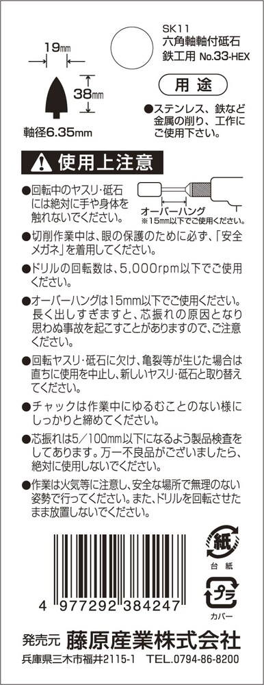 | 軸径:6.35mm六角軸。サイズ:19×38mm。ドリル回転数:5000rpm以下。粒度:WA60MV。対応機種:電気ドリル・インパクトドライバー。 |