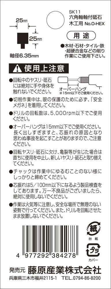 | 軸径:6.35mm六角軸 サイズ:25*25mm ドリル回転数:5000rpm以下 粒度:GC80JV 対応機種:電気ドリル・インパクトドライバー |