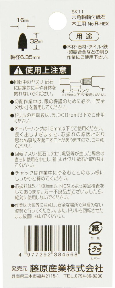 | 軸径:6.35mm六角軸 サイズ:16*32mm ドリル回転数:5000rpm以下 粒度:GC80JV 対応機種:電気ドリル・インパクトドライバー |