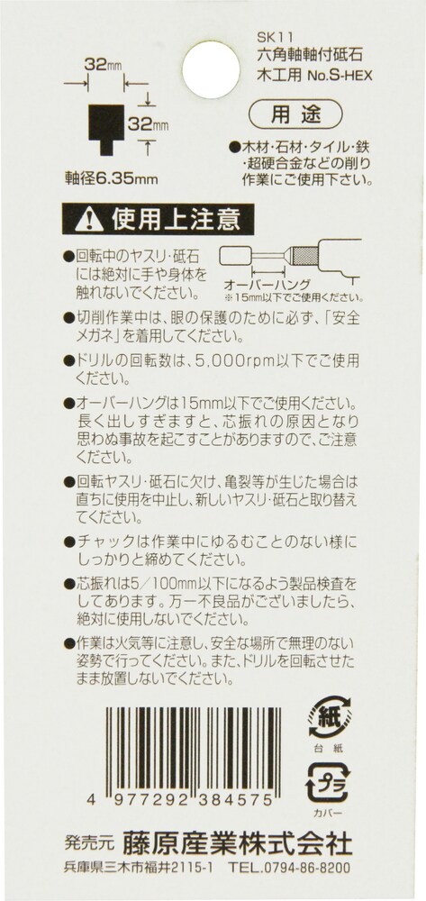 | 材質:特殊鋼 軸径:6.35mm六角軸 サイズ:32*32mm ドリル回転数:5000rpm以下 粒度:GC80JV 対応機種:電気ドリル・インパクトドライバー |
