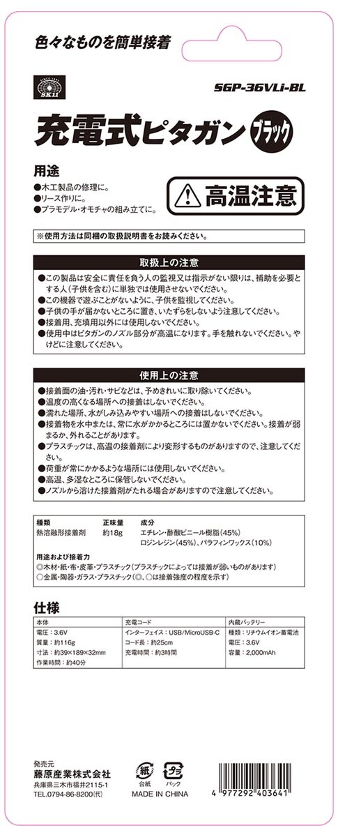 ・この製品は安全に責任を負う人の監視、または指示がない限りは、補助を必要とする人(子供を含む)に単独では使用させないでください。この機器で遊ぶことがないよう、子供を監視してください。子供の手が届かないところに保管し、いたずらをしないよう注意してください。接着用、充填用以外には使用しないでください。・使用中はピタガンのノズル部分が高温になります。手を触れないでください。やけどに注意してください。