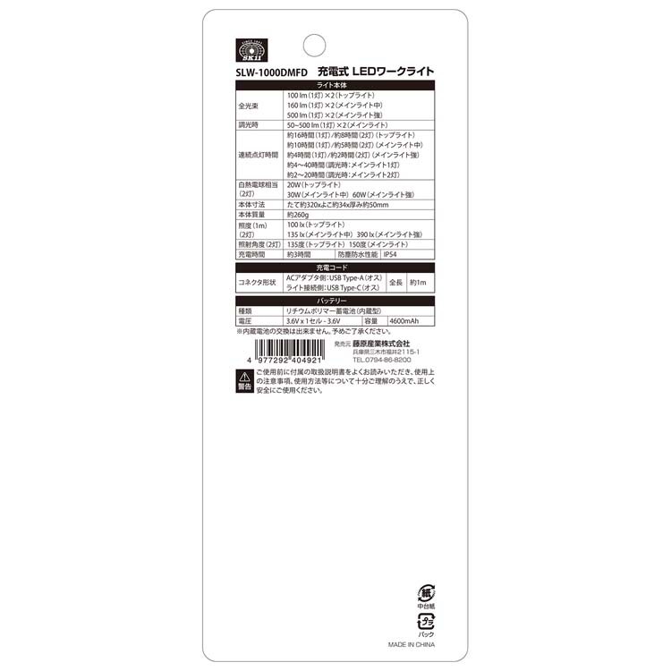 【SK11 充電式LEDワークライト 角度自在 メイン100~1000Lm トップ200Lm SLW-1000DMFDの商品詳細】