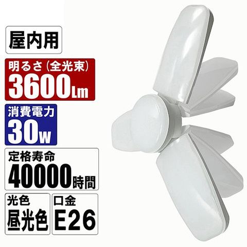 | ・消費電力:30W ・全光束:3600lm ・LED電球定格寿命:40000時間 ・光色:昼光色 ・口金:E26 |