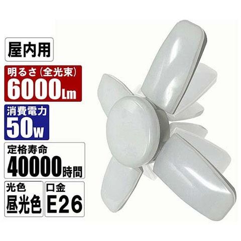 | ・消費電力:50W ・全光束:6000lm ・LED電球定格寿命:40000時間 ・光色:昼光色 ・口金:E26 |