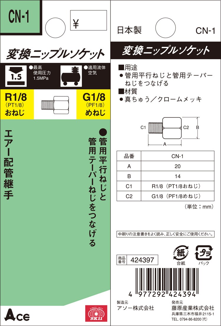 SK11 変換ニップルソケット CN-1 R1/8 G1/8 エアー配管継ぎ手 (1個)