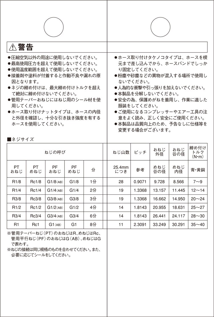 接続ねじ:おねじR(PT)1/8・めねじG(PF)1/8。適用流体:空気。最高使用圧力:1.5MPa。(材質)真鍮。