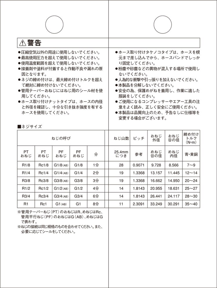 | ・接続ねじ:おねじR(PT)1/2・めねじG(PF)1/2 ・適用流体:空気 ・最高使用圧力:1.5MPa ・材質:真鍮。 |