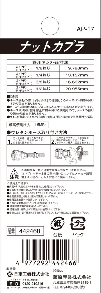 | 取付ホースサイズ:内径8.5mm・外径12.5mm 最高使用圧力:1.5MPa ウレタンホース取付用ナットカプラ 適用流体:空気 |