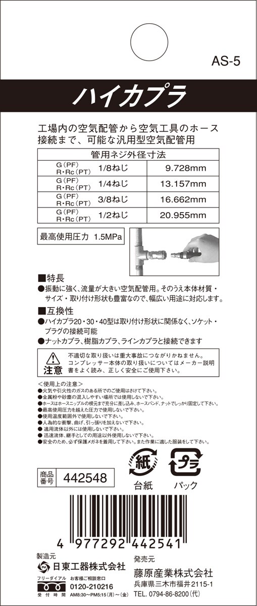 ●工場内の空気配管から空気工具のホース接続用まで、汎用性に優れたカプラです。