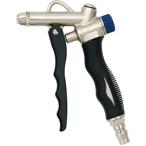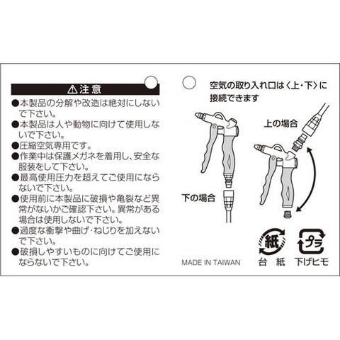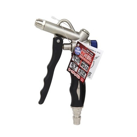 | ・ノズル:セフティノズル ・空気消費量:70~470L/min ・最高使用圧力:0.7MPa ・エアー取り入れ口ねじ:M12X1.0 ・ノズル取付ネジ:G1/8(PF1/8めねじ) ・適用流体:空気 ・ダイヤル式無段階流量調整 ・材質:本体:アルミダイキャスト・他。グリップ:エラストマー樹脂。 |