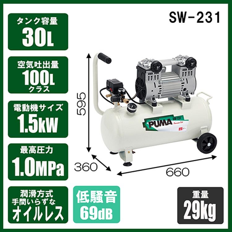 【藤原産業 SK11 オイルレスエアコンプレッサー 100V 8L SW-231 SW-L30LPF-01の商品詳細】