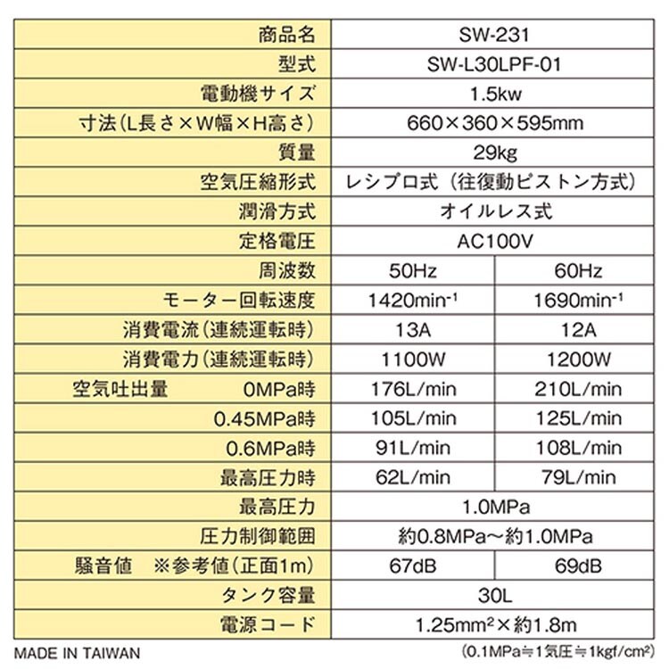 | 電動機サイズ:1.5kW 定格電圧:AC100V 定格周波数:50/60Hz 消費電流:13/12A 定格消費電力:1100/1200W 定格時間:連続 空気圧縮方式:レシプロ式(往復動ピストン方式) 圧力制御範囲:0.8-1.0MPa 最高使用圧力:1.0MPa タンク容量:30L 空気吐出量(L/min):(0MPa時)176/210・(0.45MPa時)105/125・(0.6MPa時)91/108・(最高圧力時)62/79 騒音レベル(参考値)(db(A)/1.5m):67/69 |
