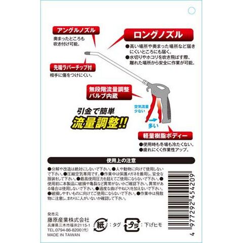 | ・空気消費量:310L/min ・最高使用圧力:0.7MPa ・ノズル取付ねじ:G1/8 ・空気取り入れ口ねじ:Rc1/4 ・ノズル長さ:300mm |