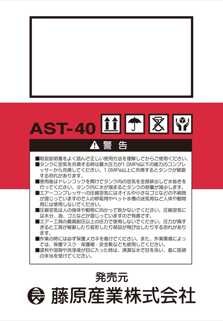 | ・エアータンク容量38L ・空気取り入れ口:ワンタッチプラグ・空気取出し口ワンタッチソケット(2口) ・最高圧力1.0MPa ・空気取入れ口逆止弁付き ・接続継ぎ手:ワンタッチソケット・プラグ ・取出し圧力調整器付(1口) ・本体乾燥質量:16kg |