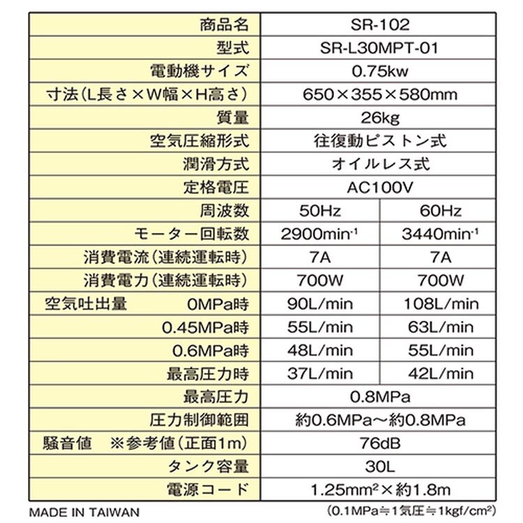 | タンク容量:30L 空気吐出量(50Hz):0Mpa時90L/min・0.45Mpa時55L/min・0.6Mpa時48L/min・最高圧力時37L/min 空気吐出量(60Hz):0Mpa時108L/min・0.45Mpa時63L/min・0.6Mpa時55L/min・最高圧力時42L/min 圧力制御範囲:約0.6~0.8Mpa 消費電力:700W 出力:0.75kW 常圧仕様(1/4カプラ仕様) 電動機サイズ:0.75kW 空気圧縮方式:往復動ピストン方式 潤滑方式:オイルレス方式 最高圧力:0.8Mpa |