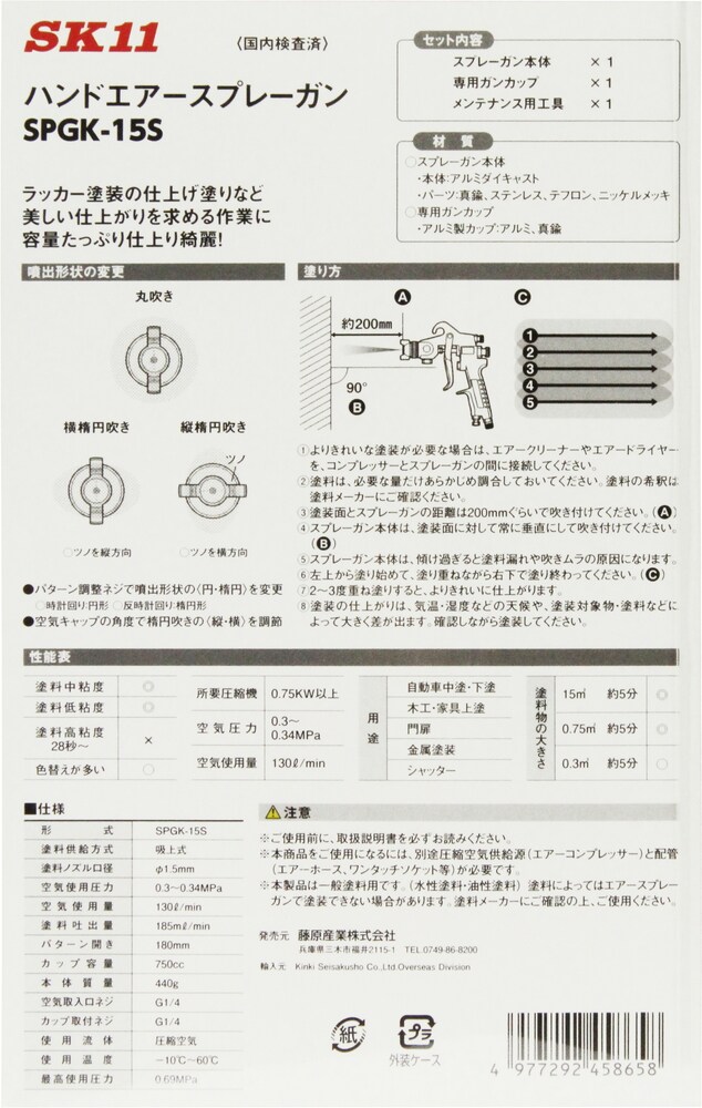 【藤原産業 SK11 ハンドエアースプレーガン 吸上式 SPGK-15Sの商品詳細】