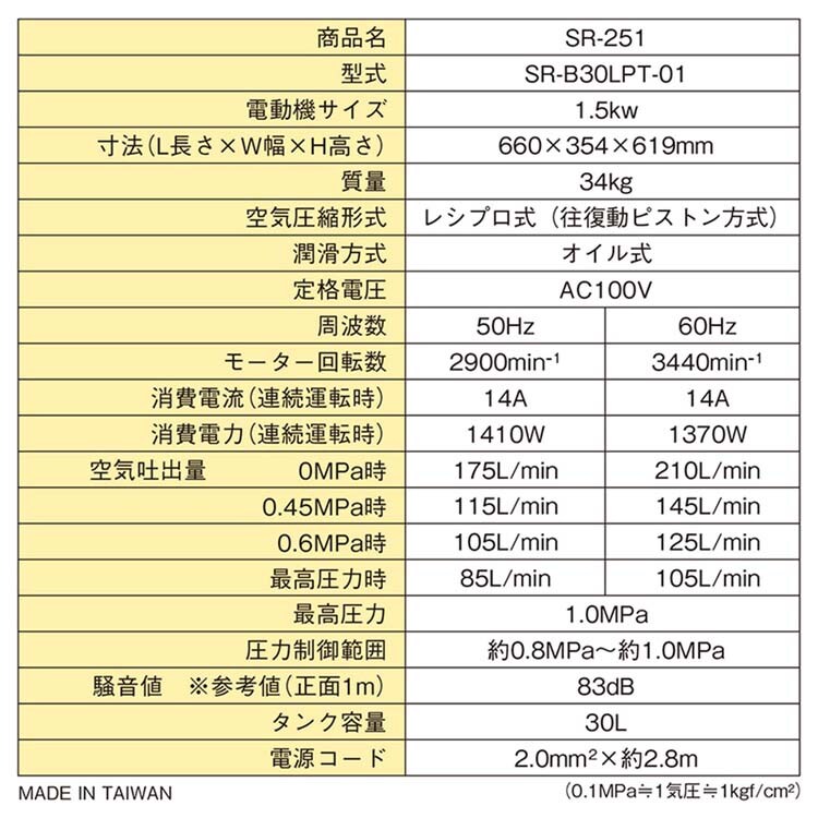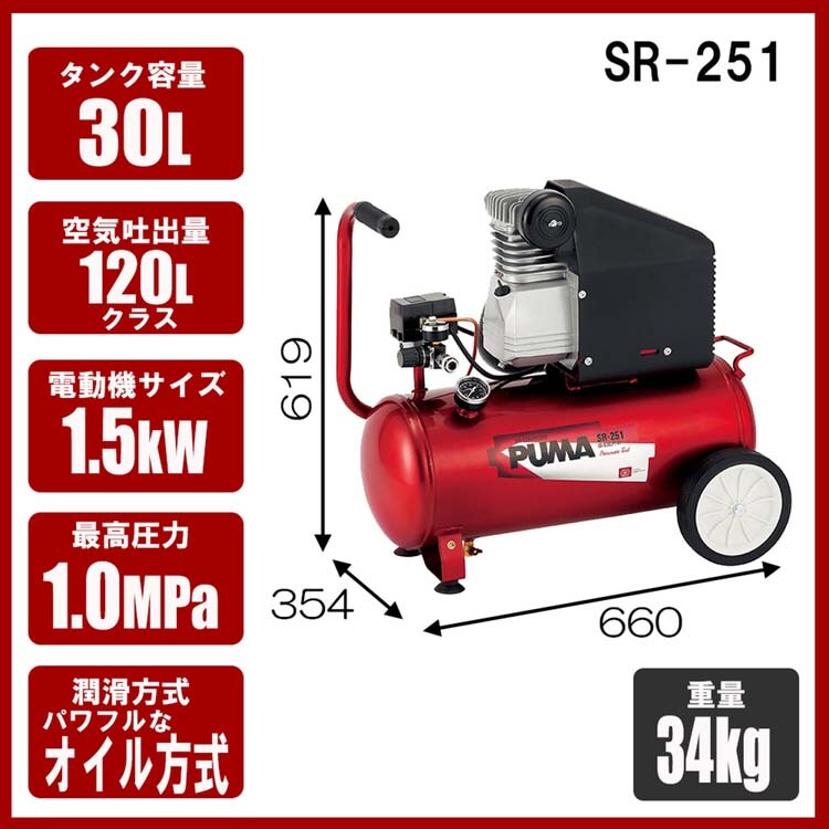 【SK11 オイル式エアコンプレッサー 100V 30L SR-251 SR-B30LPT-01の商品詳細】
