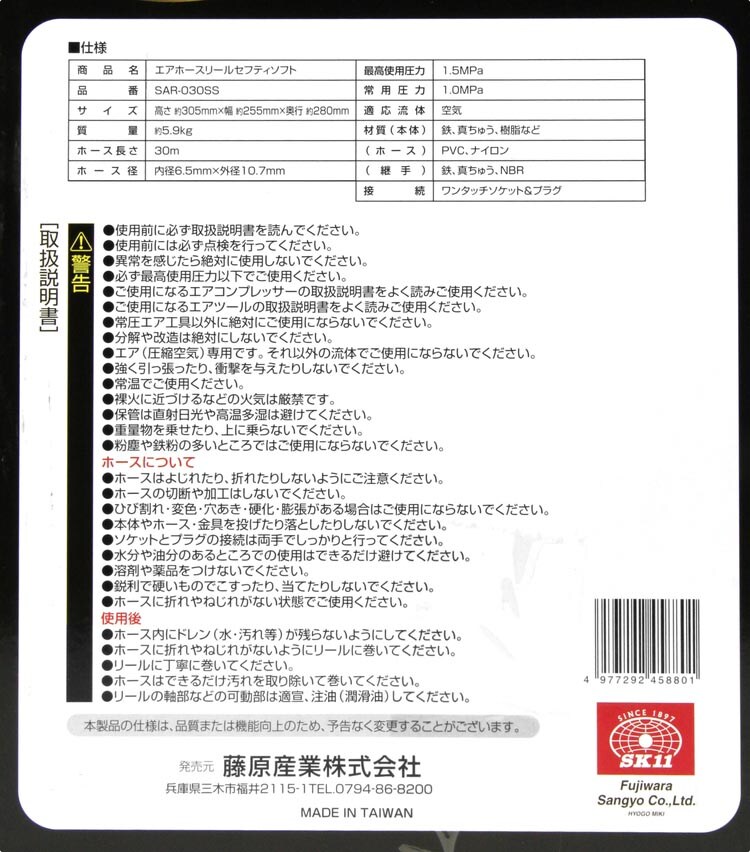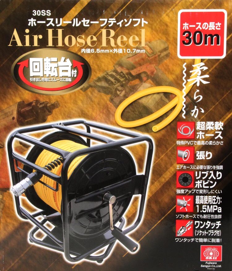 藤原産業 SK11 エアホースリール セーフティソフト 回転台付 30m SAR-030SS (1個入)