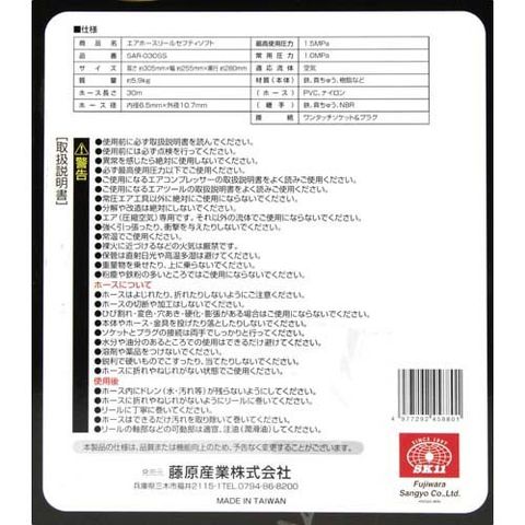 | ・サイズ:(約)高さ305×幅255×奥行280mm ・質量:(約)5.9kg ・ホース長:30m ・ホース径:内径6.5×外径10.7mm ・最高使用圧力:1.5MPa ・常用圧力:1.0MPあ ・適応流体:空気 ・材質:(本体)鉄、真鍮、樹脂など、(ホース)PVC、ナイロン、(継手)鉄、真鍮、NBR ・接続:ワンタッチソケット&プラグ |