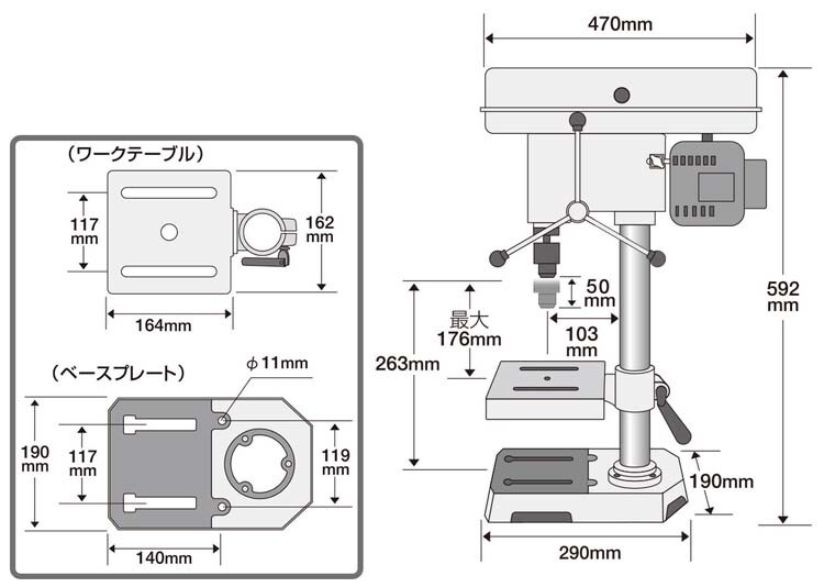 | ・電源:単相交流100V・電流3.2/3.3A ・消費電力:270/300W ・無負荷回転数:700-3000/600-2600(60Hz/50Hz) ・穴あけ能力:鉄工8mm・木工24mm ・キリの最大送り寸法:50mm・フトコロ寸法103mm ・テーブル上下移動距離:176mm・テーブル作業面:162X164mm・ベースーチャック間最大距離:270mm ・チャック:13mm・取付軸:ジャコブステーパーJT33 ・全高さ:592mm・本体質量:18.5kg |