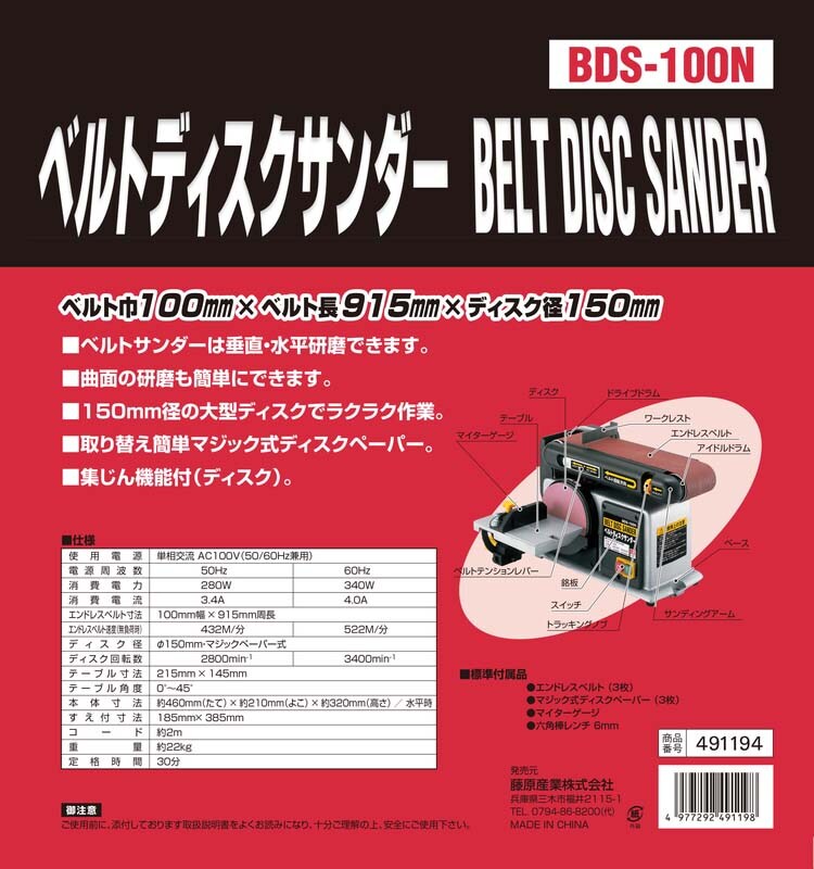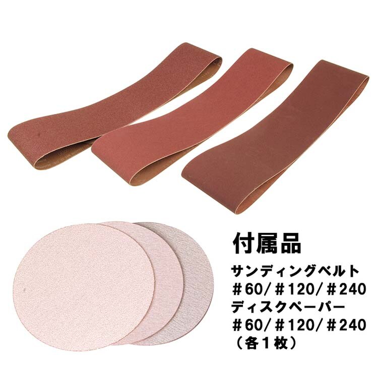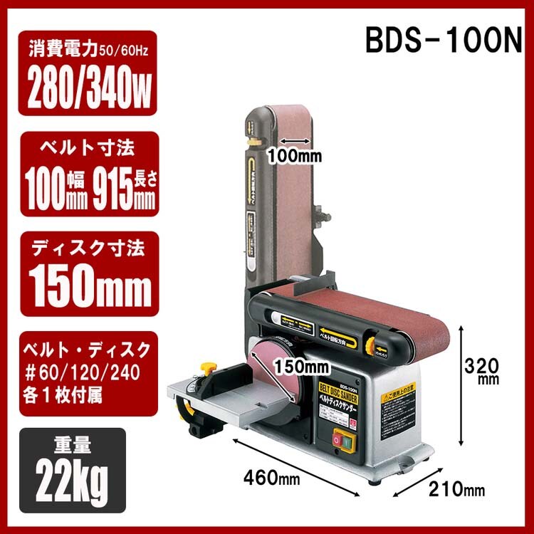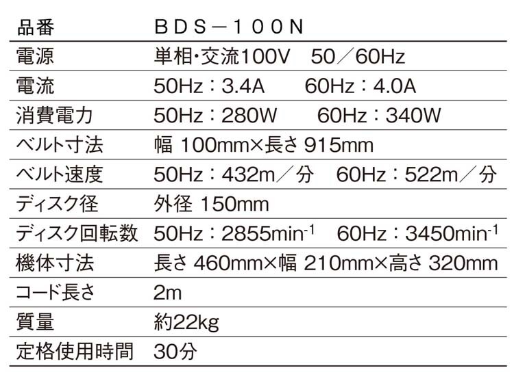 | ・電源:単相交流100V(50/60Hz共用) ・電流(50Hz/60Hz):3.4A/4.0A ・消費電力(50Hz/60Hz):280W/340W ・研磨ベルト寸法:100mm幅×915mm周長 ・ベルト速度:50Hz:432m/分・60Hz:522m/分 ・ディスクペーパー径:150mm ・ディスク回転数:50Hz:2855回転/分・60Hz:3450回転/分 ・コード長:約2.0M |