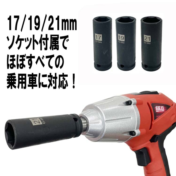 ●17mm、19mm、21mmのソケットを標準付属しています。