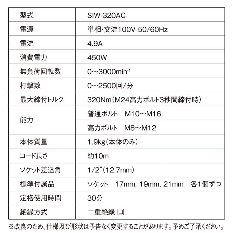 | ・電源:単相・交流100V 50/60Hz ・電流:4.9A ・消費電力:450W ・無負荷回転数:0~3000min-1 ・打撃回数:0~2500回/分 ・最大締付トルク:320Nm(M24高力ボルト3秒間締付時) ・能力:普通ボルト M10~M16、高力ボルト M8~M12 ・本体質量:1.9kg(本体のみ) ・コード長さ:約10m ・ソケット差込角:1/2(12.7mm) ・標準付属品:ソケット 17mm、19mm、21mm 各1個ずつ ・定格使用時間:30分 ・絶縁方式:二重絶縁 |