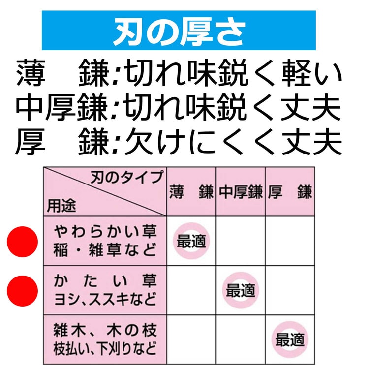 ●柔らかい草から小枝(5mm程度)の刈払い作業まで使える鋭い切れ味と耐久性を兼ね備えています。