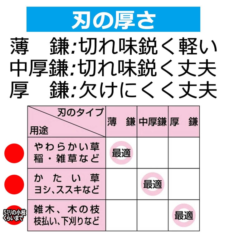 ●柔らかい草から小枝(5mm程度)の刈払い作業まで使える鋭い切れ味と耐久性を兼ね備えています。
