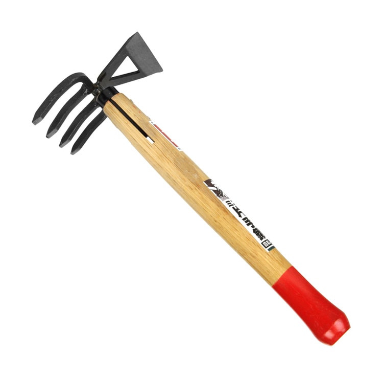 | ・タイプ:4本レーキ ・柄長:約260mm ・頭サイズ:鍬側(約)幅80mm×長さ50mm・レーキ側(約)幅85mm×爪長55mm ・材質:ヘッド部:S45C。柄:椎 |