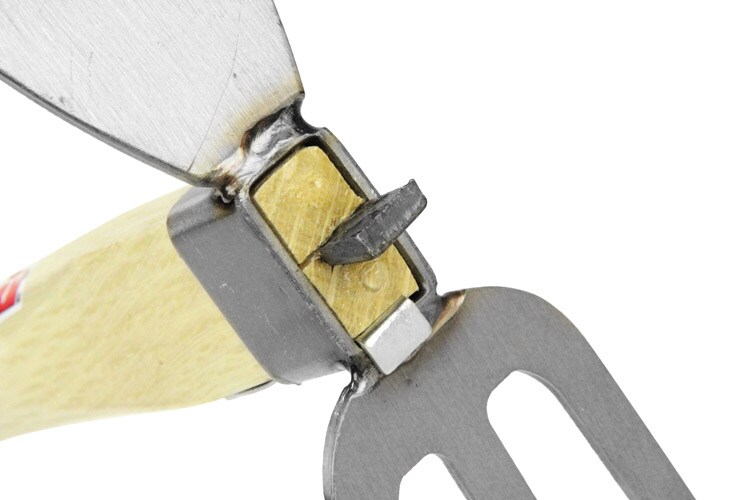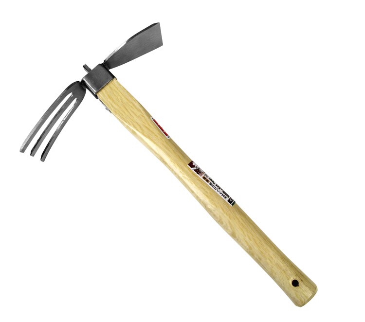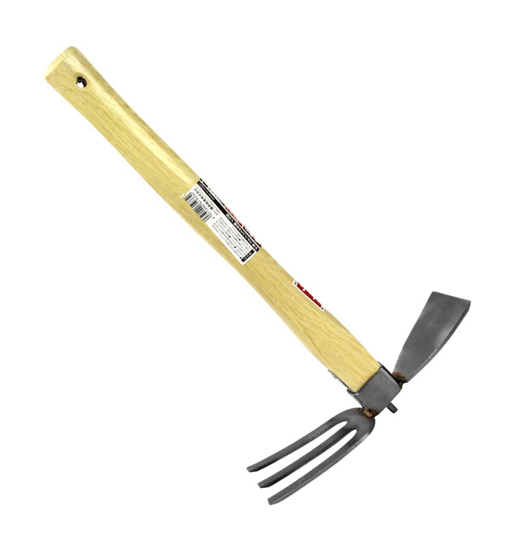 | ・タイプ:イカ型 ・柄長:385mm ・幅広鍬側(約):刃幅65mm×刃長80mm ・3本爪側(約):刃幅75mm×刃長100mm ・材質:ヘッド部:ステンレス(420J2)。柄:樫 |