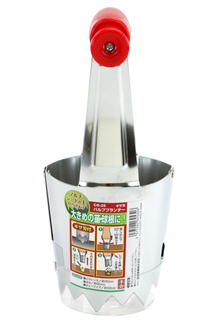 | ・植付部サイズ:内径約75mm×高さ約110mm ・ギザ刃付 ・メモリ付 ・材質:本体:鉄。ハンドル:PVC |