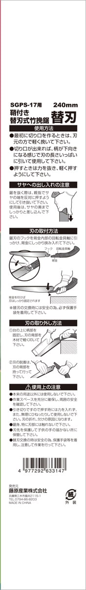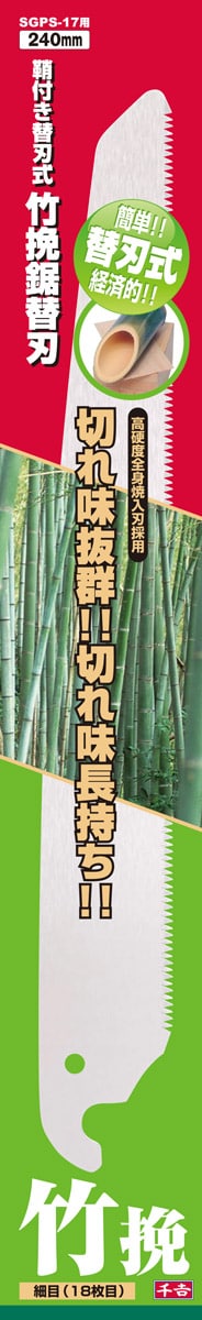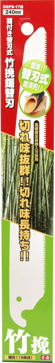 刃長:240mm。最適切断目安:約120mm。細目(18枚目)。高硬度全身焼入刃。適合本体:千吉鞘付き替刃式竹挽鋸240・SGPS-17。(材質)本体:刃物鋼。